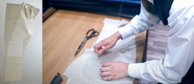毛芯とは、表地と裏地の間に据えられる芯地のことで、胸元に自然な立体感を生み出します。